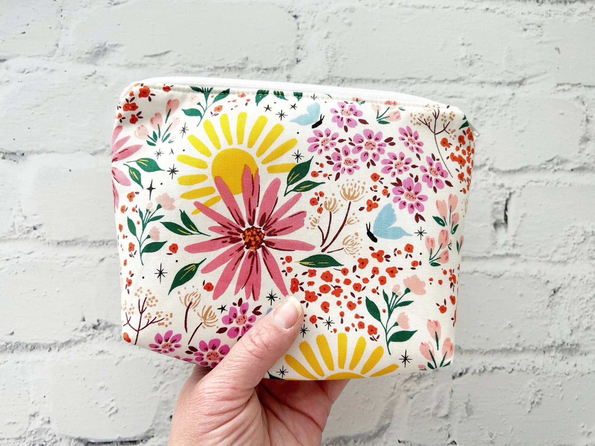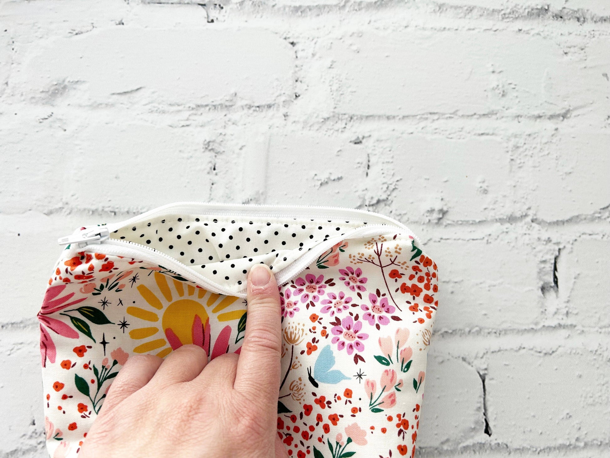 This bag is made with quality quilting cotton with a thick interfacing to give it structure. The inside of bag is made with polka dot quilting cotton. Details: Approximately 7x6 inches and 1 inch in depth to help it stand up.